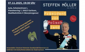 Am 7. November 2025 durfte die Deutsch-Polnische Gesellschaft Hannover e. V. in der ausverkauften Aula am Planetenring in Garbsen einen besonderen Gast begrüßen: Steffen Möller mit seinem aktuellen Programm „Präsident von Polschland“. Mit gewohntem Charme und feinem Humor beleuchtete Möller auf seiner Bühne die deutsch-polnischen Eigenheiten und sorgte für zahlreiche humorvolle Momente.